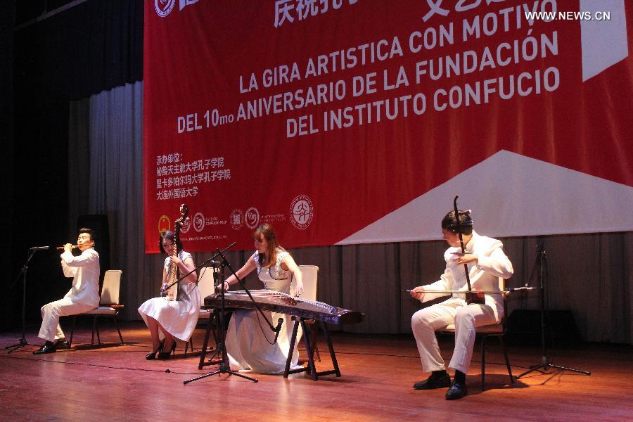 Musicians of the Student Art Association at the Dalian Foreign Language University, participate in a presentation for the 10th anniversary of the foundation of the Confucius Institutes worldwide, in San Isidro district, of Lima department, Peru, on Oct. 16, 2014. The Chinese Embassy and the Confucius Institute of the "Pontificia Universidad Catolica del Peru", organized the "Presentation of Folkloric Dance and Traditional Music of China" played by the Student Art Association at the Dalian Foreign Language University of China, in the framework of the 10th anniversary of the project of Confucius Institutes worldwide. (Xinhua/Luis Camacho)