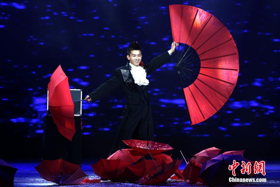 | A magician from Zhujiang College of Tianjin University of Finance and Economics performs magic with red umbrellas on the night of Oct. 15, 2014. (CNS/Zhao Hui) |
