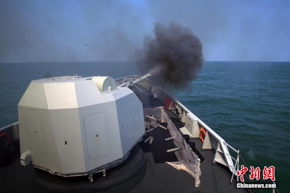 The newly-commissioned warship Quanzhou fires its main gun at the target in a maritime drill on October 15, 2014. Recently, the guided missile frigate Quanzhou of the East China Sea Fleet of the Chinese People's Liberation Army Navy (PLAN) has been engaged in coordination training with other warships of different types on various subjects including ship steering, refueling, ship towing and night navigation. This training is designed to verify the training effectiveness and speed up the generation of the combat capability of the frigate which was commissioned to the PLAN two months ago. (China News Service/Zhou Daoxian)