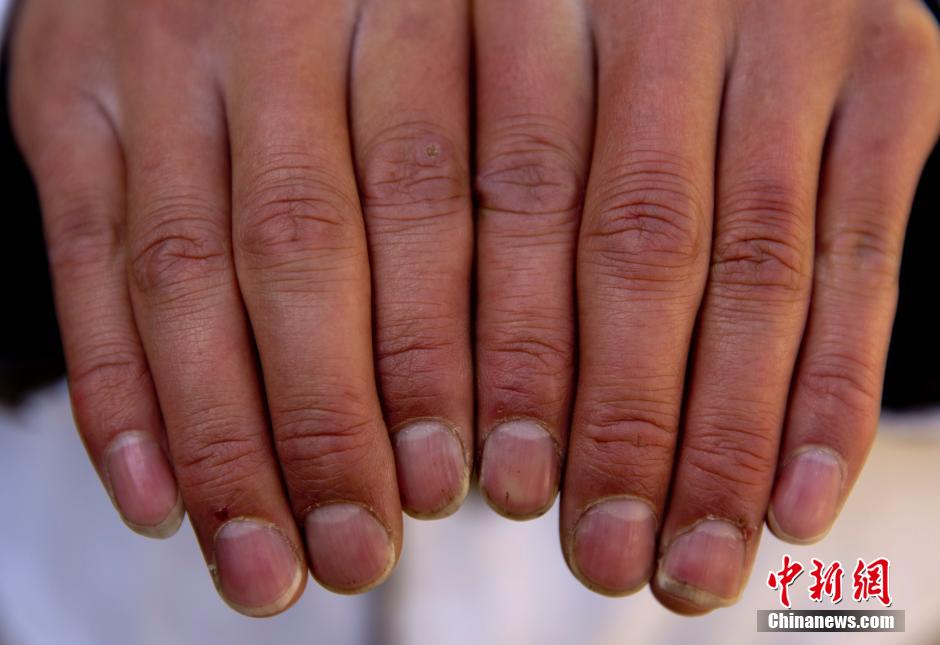 | Photo taken on Sept. 27, 2014 shows the hands of Li Zhenpeng, a soldier who has served for two years along the Qinghai-Tibet highway. The fingernails of Li and his comrade-in-arms are deformed due to their long-term plateau life. (Chinanews/Liu Guanguan) |