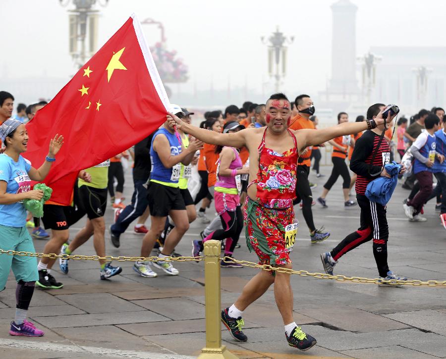 Participants take part in the 2014 Beijing International Marathon in the haze-surrounded Beijing, capital of China, Oct. 19, 2014. (Xinhua/Wang Zhen)