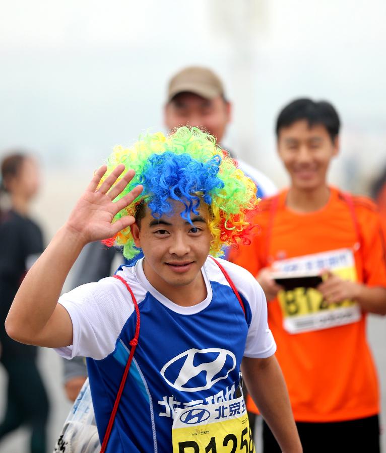A participant wearing a colorful wig waves during the 2014 Beijing International Marathon in the haze-surrounded Beijing, capital of China, Oct. 19, 2014. (Xinhua/Wang Zhen)