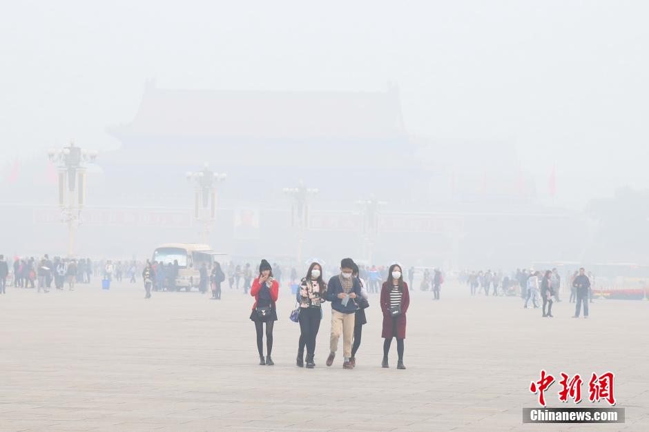 Visitors walk in the Tiananmen Square in the heavy smog. (Photo/CNS)