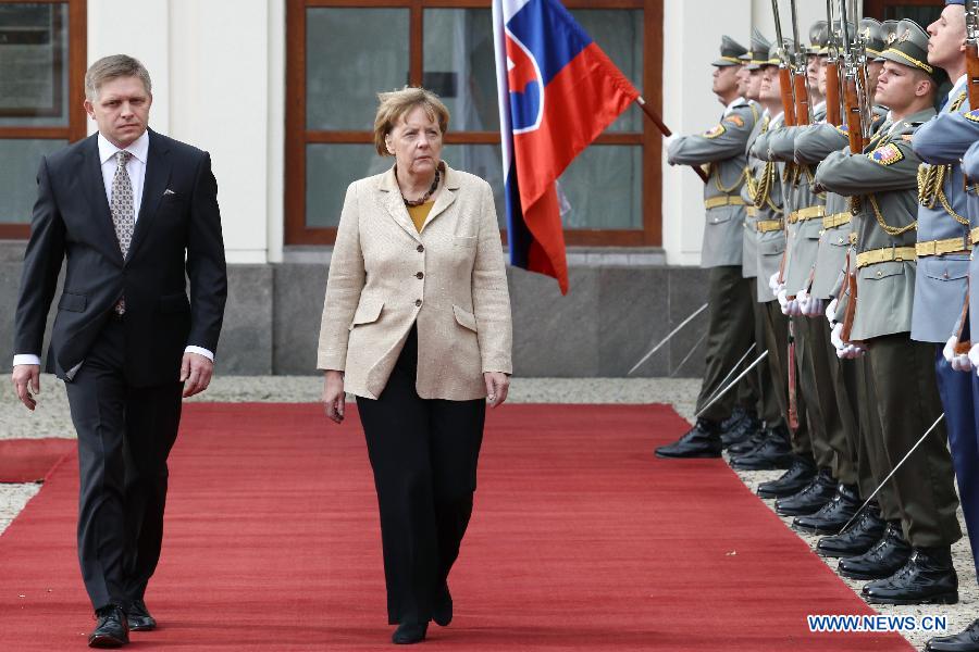 Slovakia's Prime Minister Robert Fico (L) and German Chancellor Angela Merkel inspect a guard of honor in Bratislava, Slovakia, on October 20, 2014, during Merkel's official visit to Slovakia. (Xinhua/Andrej Klizan)