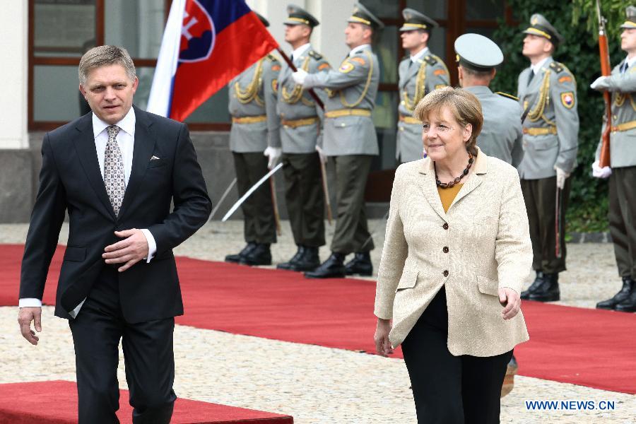 Slovakia's Prime Minister Robert Fico (L) and German Chancellor Angela Merkel inspect a guard of honor in Bratislava, Slovakia, on October 20, 2014, during Merkel's official visit to Slovakia. (Xinhua/Andrej Klizan)