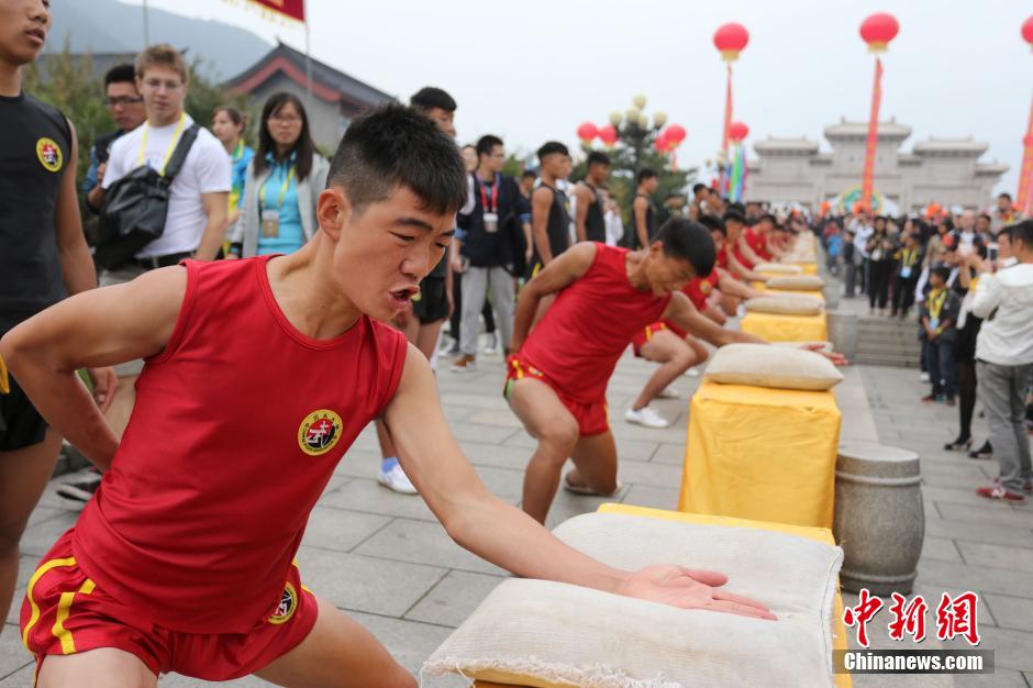 About 70,000 Shaolin disciples perform martial arts at the opening ceremony of International Shaolin Wushu Festival in Zhengzhou, central China's Henan province on Oct. 19, 2014. More than 1,800 kungfu practitioners from 63 countries and regions will participate in the three-day festival opened on Sunday. (China News Service/Zhou Xiaoyun)