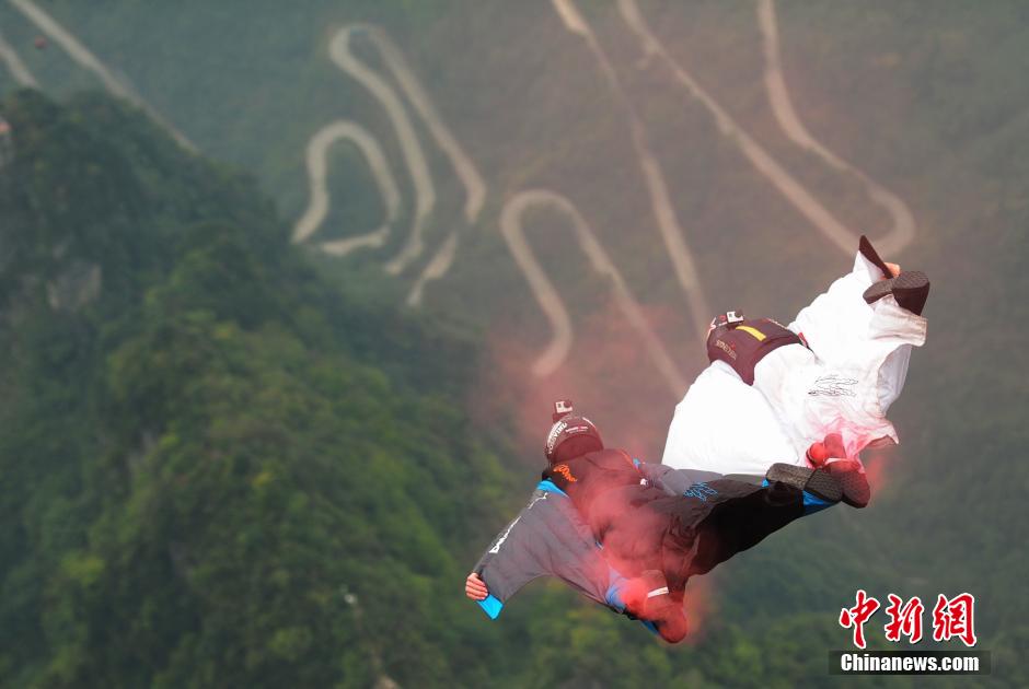 Competitors spread their wings over Tianmen Mountain in Zhangjiajie, Hunan province, during the third World Wingsuit Championship, Oct. 19, 2014. (CNS/Yang Huafeng)