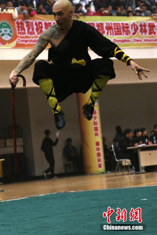 Competitor shows kung fu during the 10th Intl' Shaolin Wushu Festival in Dengfeng, central China's Henan province, Oct. 20, 2014. Nearly 2000 kung fu masters from 63 countries participated in the festival. (CNS/Yang Zhenghua)