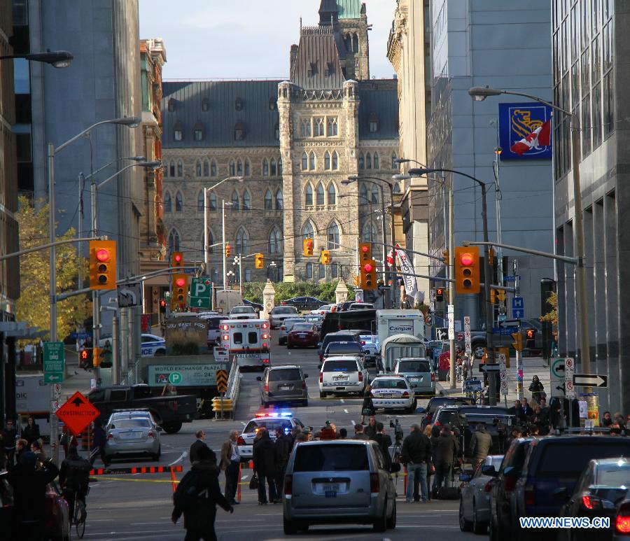 Policemen blank off the street near the Canadian parliament building in Ottawa, Canada, on Oct. 22, 2014. A Canadian soldier standing guard at the National War Memorial in Ottawa was gunned down and a security guard in the nearby parliament buildings wounded on Wednesday in an attack that police believe involved more than one gunman. (Xinhua/Li Baodong)