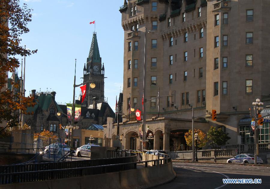 A street blanked off by policemen is seen near the Canadian parliament building in Ottawa, Canada, on Oct. 22, 2014. A Canadian soldier standing guard at the National War Memorial in Ottawa was gunned down and a security guard in the nearby parliament buildings wounded on Wednesday in an attack that police believe involved more than one gunman. (Xinhua/Li Baodong)
