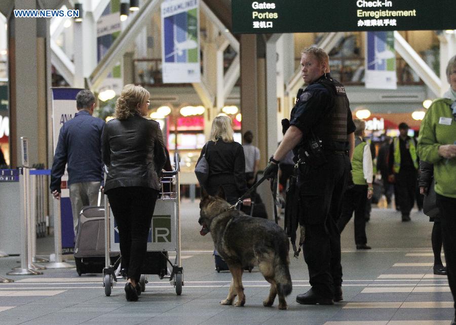 A policeman patrols along the departure hall with dog at the Vancouver International Airport in Vancouver, Canada, Oct. 22, 2014. After the shooting at the National War Memorial and Parliament Hill in Ottawa on Wednesday, provinces across Canada stepped up the security measures including airports have been heightened their security levels in response to the terrorist attack. (Xinhua/Liang Sen)