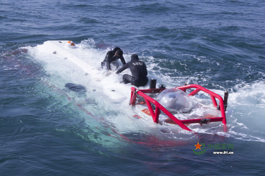 From October 21 to October 23, 2014, a rescue team of the North China Sea Fleet conducts a recue drill in bad weather conditions. A LR-7 type deep submergence rescue vessel successfully connected with a submarine 40 meters under the sea surface and transferred 8 submariners. (www. 81.cn/Wang Changxin and Meng Lingyu)