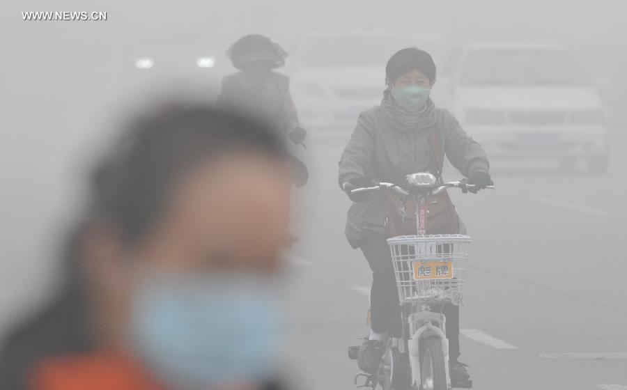 A woman wearing mask rides in smog-shrouded Tianjin, north China, Oct. 25, 2014. (Xinhua/Yue Yuewei)