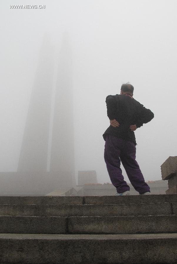 Wang Jiang, 78, dose morning exercises at a smog-shrouded square in Tangshan City, north China's Hebei Province, Oct. 25, 2014. (Xinhua/Zheng Yong)