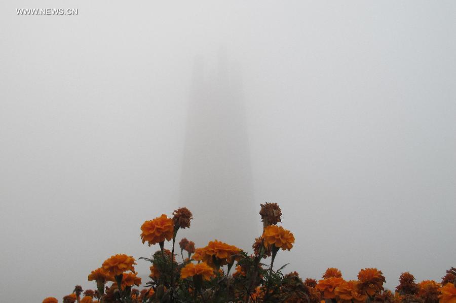 A monument is shrouded in smog in Tangshan City, north China's Hebei Province, Oct. 25, 2014. (Xinhua/Zheng Yong)