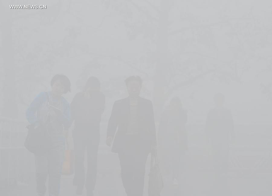 People walk in smog in Tianjin, north China, Oct. 25, 2014. (Xinhua/Yue Yuewei)