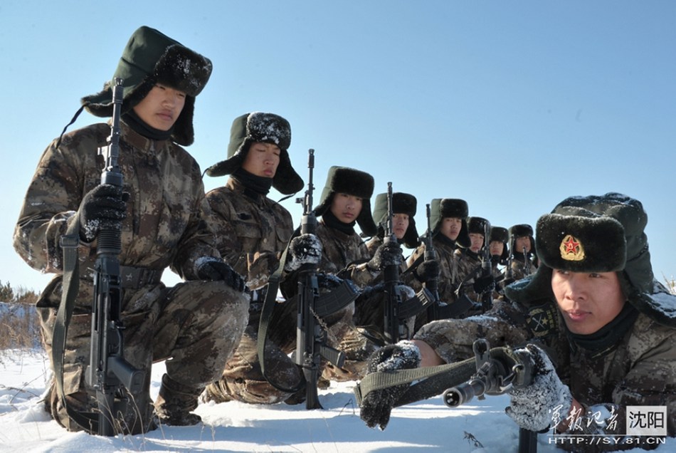 After a snow storm, soldiers from Shenyang Military Region conduct military drill about fighting skills on snowy fields and shooting exercise under freezing weather in Mohe, northeast China's Heilognjiang province on Oct.19, 2014 (Chinamil.com.cn/PLA Daily)