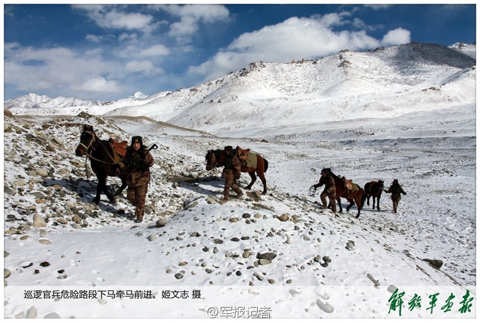 Soldiers lead horses through dangerous area. (PLA Pictorial/Ji Wenzhi)