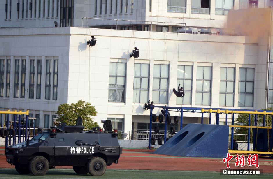 A comprehensive anti-terrorist drill is held in Hefei, central China’s Anhui province on Oct. 26, 2014. Over 600 emergency personnel and 77 emergency vehicles from eight emergency response forces, including special police, armed police, fire department, medical aid, etc., participated in the drill. (Chinanews/Zhang Yazi)