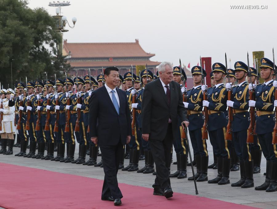 | Chinese President Xi Jinping (front L) holds a welcoming ceremony for visiting Czech President Milos Zeman before their talks in Beijing, capital of China, Oct. 27, 2014. (Xinhua/Ding Lin) |