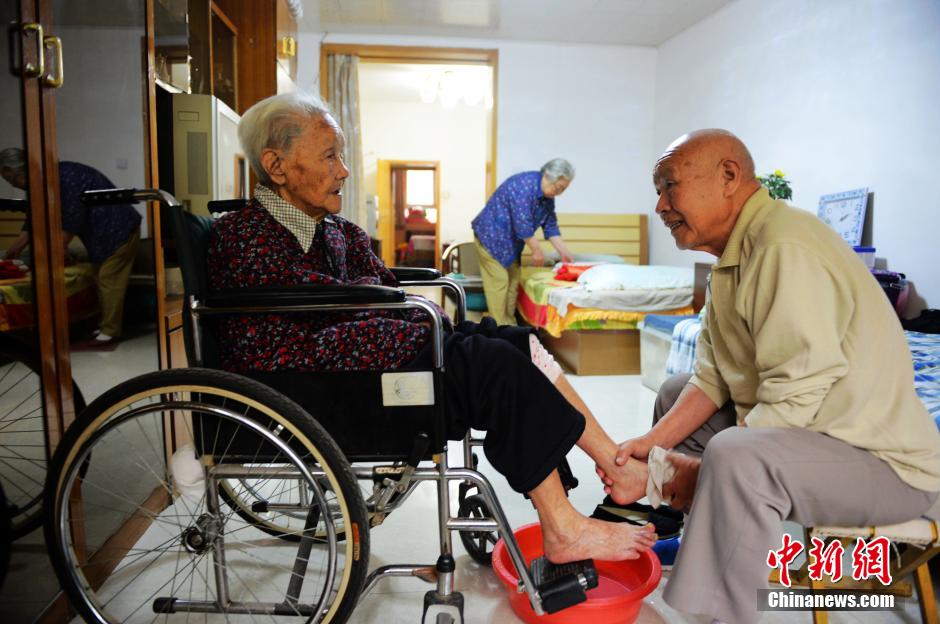 Zheng Chongqi washes feet and gives massage for his mother. (CNS/Hu Qingming)