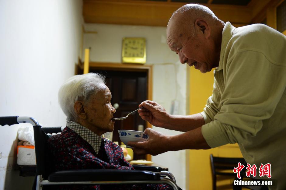 Zheng Chongqi feeds his mother. (CNS/Hu Qingming)