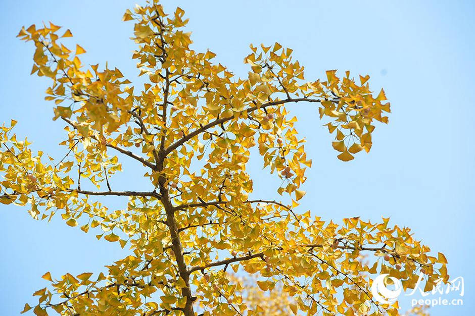 People enjoy the scenery of gingkgo leaves at Dongwujie in the Sanlitun area of Beijing on Oct. 27, 2014. The beautiful scenery of gingkgo trees in the city attract visitors every autumn. (People's Daily Online/Weng Qiyu)