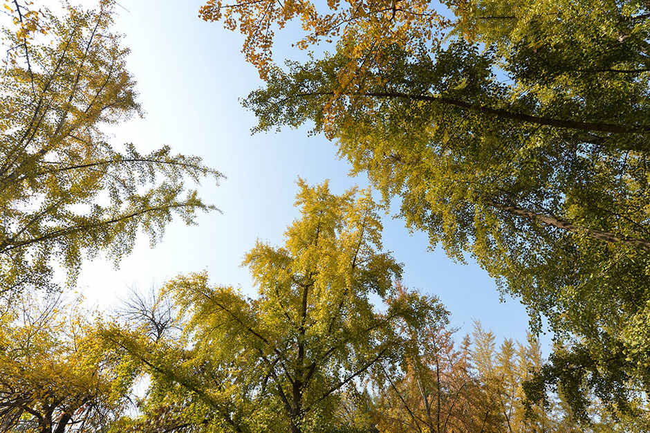 | People enjoy the scenery of gingkgo leaves at Dongwujie in the Sanlitun area of Beijing on Oct. 27, 2014. The beautiful scenery of gingkgo trees in the city attract visitors every autumn. (People's Daily Online/Weng Qiyu) |