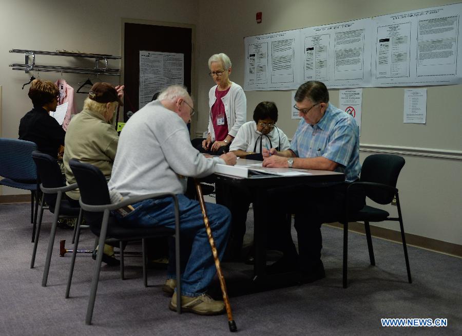 Registered electors cast ballots at a polling station in Fairfax County, Virginia, the United States, on Oct. 28, 2014. Early voting of U.S. midterm elections was held at Fairfax County Government Center on Tuesday. (Xinhua/Bao Dandan)