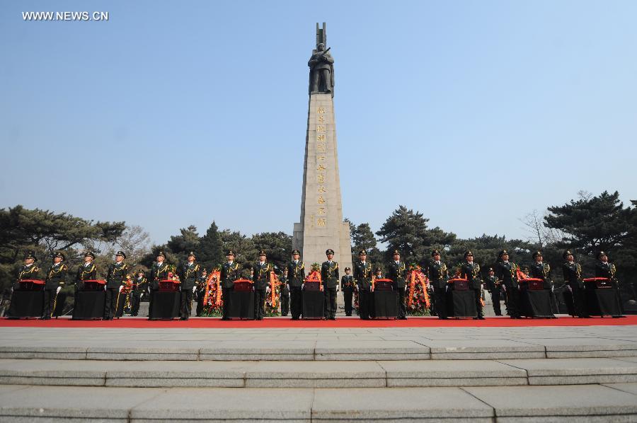 A burial ceremony for the remains of 437 Chinese People's Volunteer Army (CPVA) soldiers who died in the Korean War (1950-1953) is held in Shenyang, capital of northeast China's Liaoning Province, Oct. 29, 2014. A burial ceremony for the remains of 437 CPVA soldiers who died in the Korean War was held on Wednesday at a war martyr cemetery in Shenyang. The remains of the 437 war martyrs had been kept in South Korea before they were returned to China last March. (Xinhua/Pan Yulong)