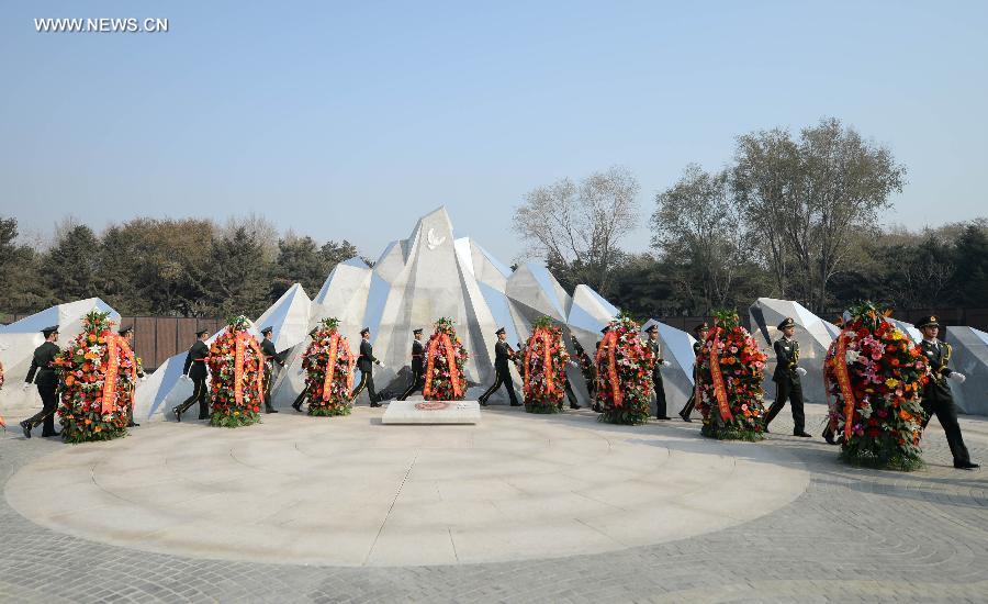 Soldiers present flower wreaths to a set of momumental sculptures during a burial ceremony for the remains of 437 Chinese People's Volunteer Army (CPVA) soldiers who died in the Korean War, in Shenyang, capital of northeast China's Liaoning Province, Oct. 29, 2014. A burial ceremony for the remains of 437 CPVA soldiers who died in the Korean War was held on Wednesday at a war martyr cemetery in Shenyang. The remains of the 437 war martyrs had been kept in South Korea before they were returned to China last March. (Xinhua/Pan Yulong)