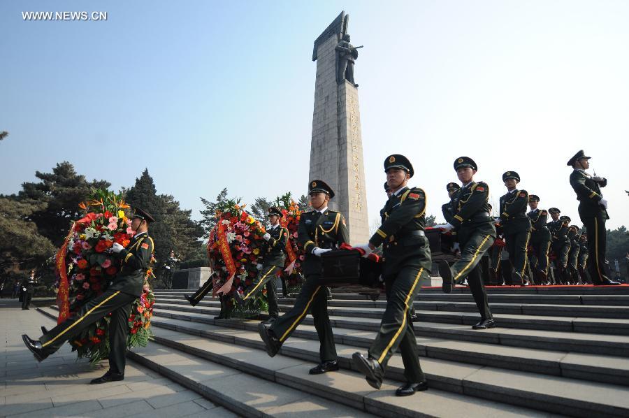 Soldiers accompany the remains of Chinese People's Volunteer Army (CPVA) soldiers who died in the Korean War (1950-1953) during a burial ceremony in Shenyang, capital of northeast China's Liaoning Province, Oct. 29, 2014. A burial ceremony for the remains of 437 CPVA soldiers who died in the Korean War was held on Wednesday at a war martyr cemetery in Shenyang. The remains of the 437 war martyrs had been kept in South Korea before they were returned to China last March. (Xinhua/Pan Yulong)