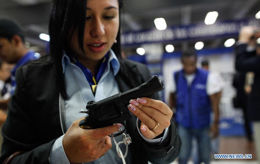 | A visitor views a weapon at the 4th International Fair of Defense and Security "Expodefensa" in Bogota, capital of Colombia, Oct. 29, 2014. The "Expodefensa" fair, specialized in tecnological development and innovation for defense and security, will be held on Oct. 29-31. (Xinhua/Jhon Paz) |