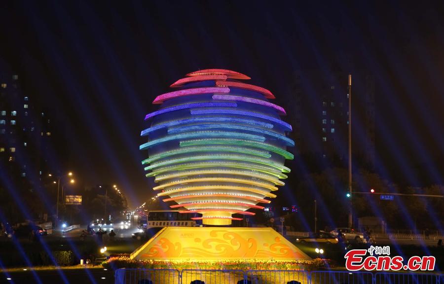 An APEC emblem-shaped light is turned on at an intersection in the Chaoyang district of Beijing, China’s capital on Wednesday evening, October 29, 2014. The emblem of the 2014 APEC meeting consists of 21 colored lines, which not only traces out the outline of the globe, but also the Temple of Heaven (Tiantan), a location for ritual ceremonies in ancient times. The emblem is a symbol of partnership and cooperation between APEC member economies. [Photo: China News Service/ Guo Junfeng]
