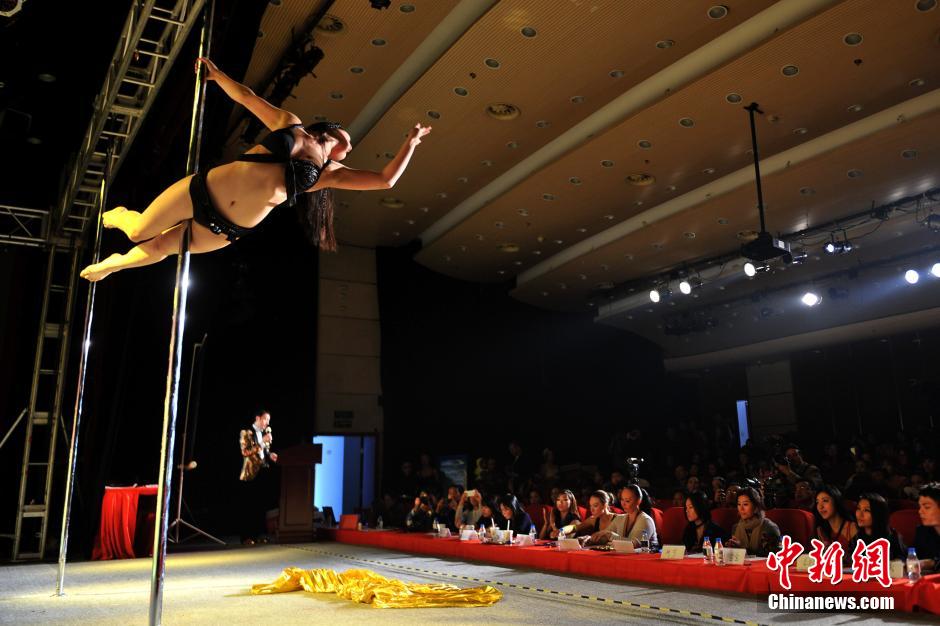The 8th World Pole Dance Championship was held in Beijing Fenglan International Theater, Oct. 29, 2014. Contestants from China, Russia, Canada, Australia, Malaysia, South Korea, Japan, and Hong Kong participated in the contest. Ms. Symone, an international level pole dancing judge and a professional pole dancer, was the main judge for the championship. (Chinanews/Jin Shuo)