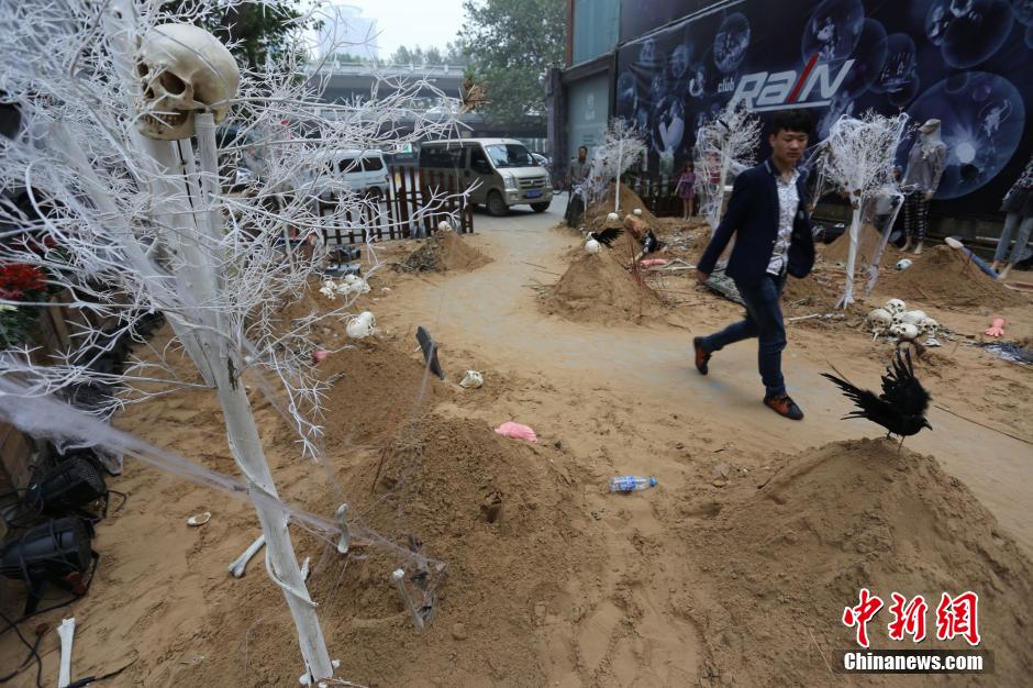Grave mounds appear in front of a KTV in Zhengzhou, Henan Province. (CNS/Yang Zhenghua)