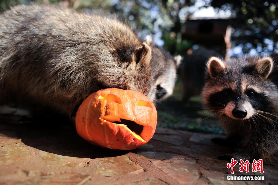 Cute coons play pumpkin lamps in Yunnan Animal Park. (CNS/Liu Ranyang)