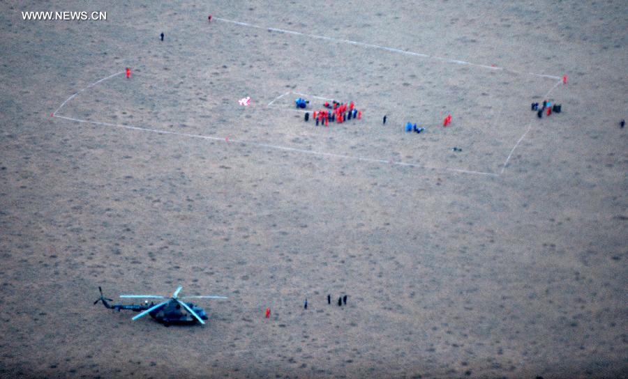 Researchers retrieve the return capsule of China's unmanned lunar orbiter in the central region of north China's Inner Mongolia Autonomous Region, Nov. 1, 2014. Return capsule of China's test lunar orbiter landed successfully early Saturday morning in north China's Inner Mongolia Autonomous Region, according to the Beijing Aerospace Control Center. (Xinhua/Ren Junchuan)