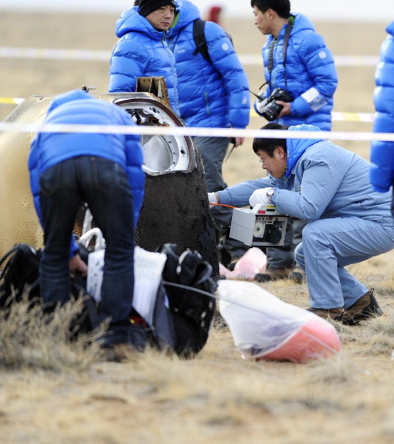 Researchers retrieve the return capsule of China's unmanned lunar orbiter in the central region of north China's Inner Mongolia Autonomous Region, Nov. 1, 2014. Return capsule of China's test lunar orbiter landed successfully early Saturday morning in north China's Inner Mongolia Autonomous Region, according to the Beijing Aerospace Control Center. (Xinhua/Shao Kun)