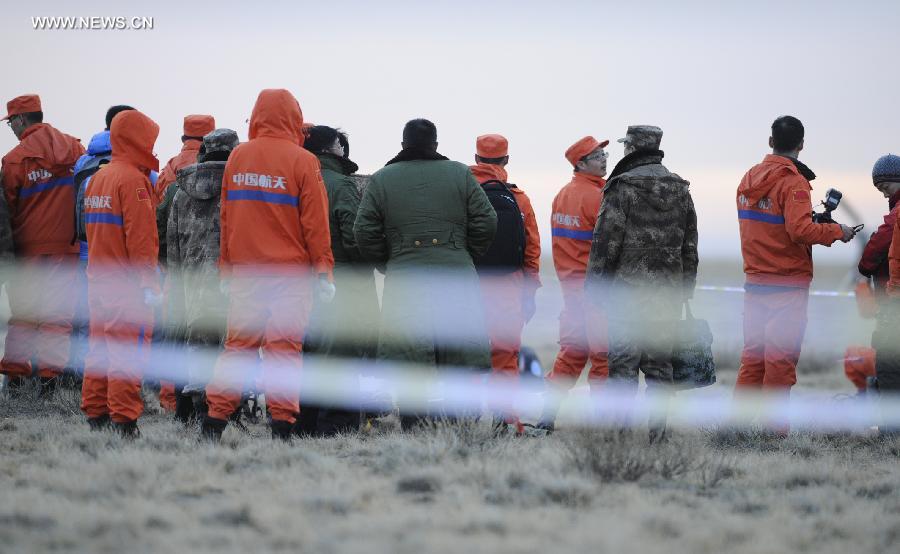 Researchers retrieve the return capsule of China's unmanned lunar orbiter in the central region of north China's Inner Mongolia Autonomous Region, Nov. 1, 2014. Return capsule of China's test lunar orbiter landed successfully early Saturday morning in north China's Inner Mongolia Autonomous Region, according to the Beijing Aerospace Control Center. (Xinhua/Shao Kun)