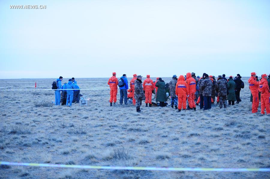 Researchers retrieve the return capsule of China's unmanned lunar orbiter in the central region of north China's Inner Mongolia Autonomous Region, Nov. 1, 2014. Return capsule of China's test lunar orbiter landed successfully early Saturday morning in north China's Inner Mongolia Autonomous Region, according to the Beijing Aerospace Control Center. (Xinhua/Shao Kun)