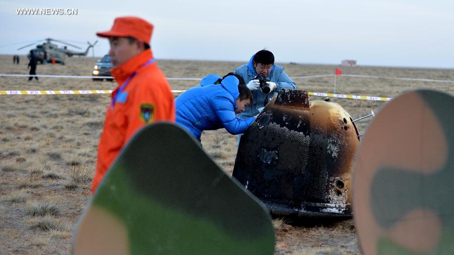 Researchers retrieve the return capsule of China's unmanned lunar orbiter in the central region of north China's Inner Mongolia Autonomous Region, Nov. 1, 2014. Return capsule of China's test lunar orbiter landed successfully early Saturday morning in north China's Inner Mongolia Autonomous Region, according to the Beijing Aerospace Control Center. (Xinhua/Ren Junchuan)