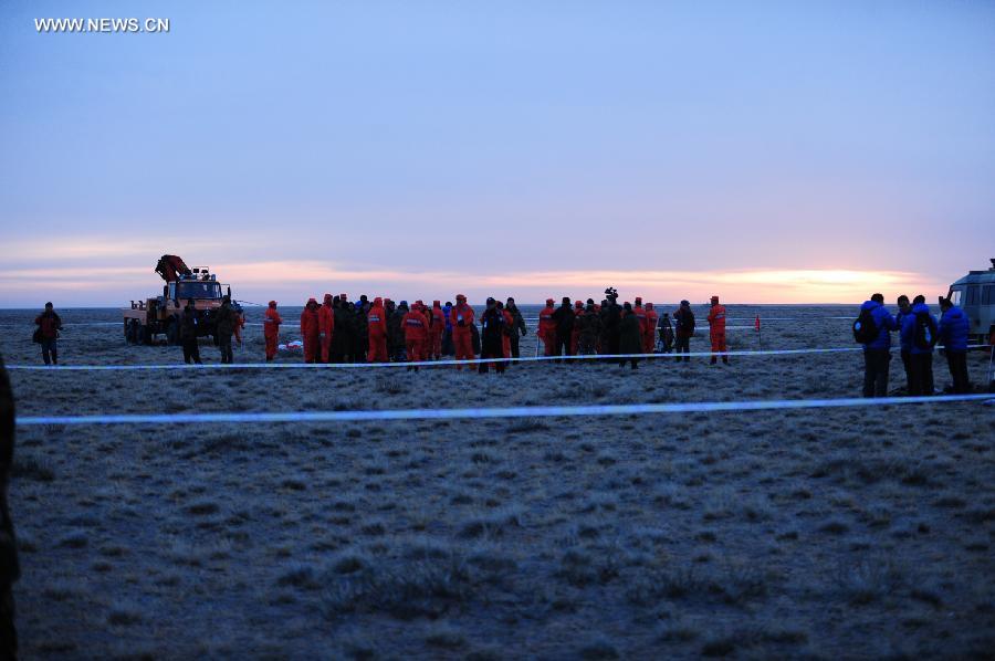 Researchers retrieve the return capsule of China's unmanned lunar orbiter in the central region of north China's Inner Mongolia Autonomous Region, Nov. 1, 2014. Return capsule of China's test lunar orbiter landed successfully early Saturday morning in north China's Inner Mongolia Autonomous Region, according to the Beijing Aerospace Control Center. (Xinhua/Shao Kun)