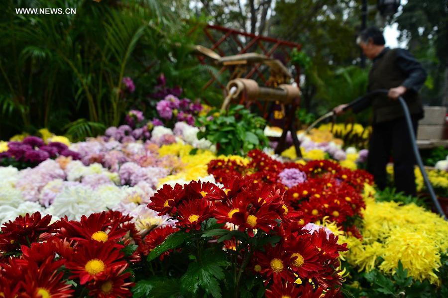A worker waters chrysanthemum flowers at Baotu Spring Park in Jinan, capital of east China's Shandong Province, Nov. 5, 2014. An autumn chrysanthemum show kicked off at Baotu Spring Park in Jinan recently. A total of some 200 kinds of chrysanthemum attracted lots of visitors. (Xinhua/Guo Xulei)