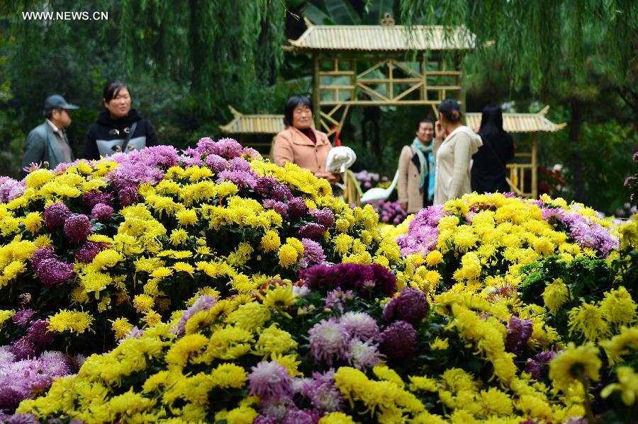 Visitors view chrysanthemum flowers at Baotu Spring Park in Jinan, capital of east China's Shandong Province, Nov. 5, 2014. An autumn chrysanthemum show kicked off at Baotu Spring Park in Jinan recently. A total of some 200 kinds of chrysanthemum attracted lots of visitors. (Xinhua/Guo Xulei)