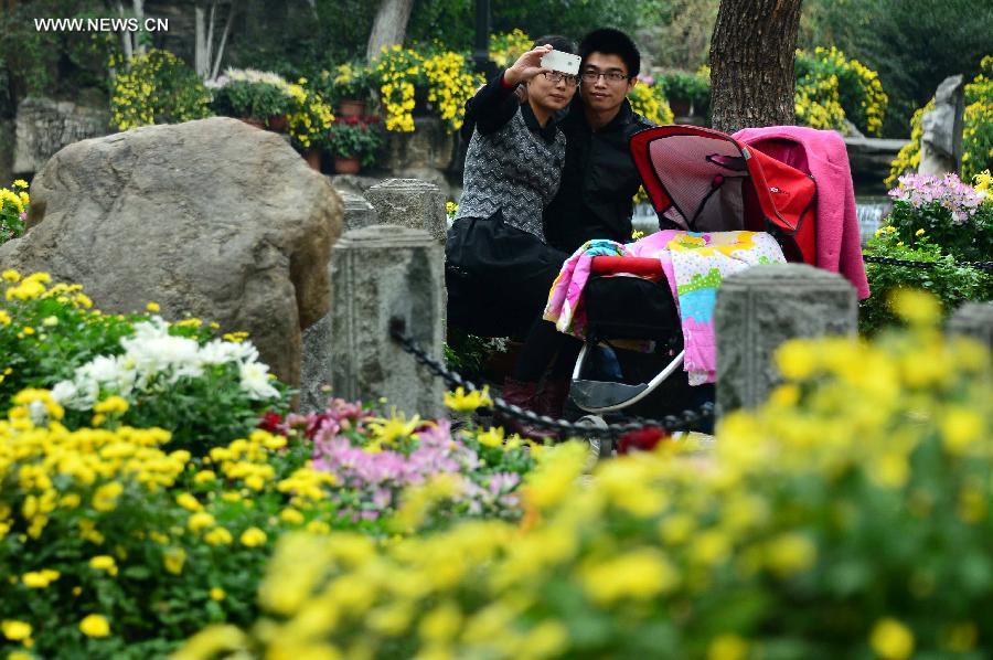 Citizens take "selfie" near chrysanthemum flowers at Baotu Spring Park in Jinan, capital of east China's Shandong Province, Nov. 5, 2014. An autumn chrysanthemum show kicked off at Baotu Spring Park in Jinan recently. A total of some 200 kinds of chrysanthemum attracted lots of visitors. (Xinhua/Guo Xulei)
