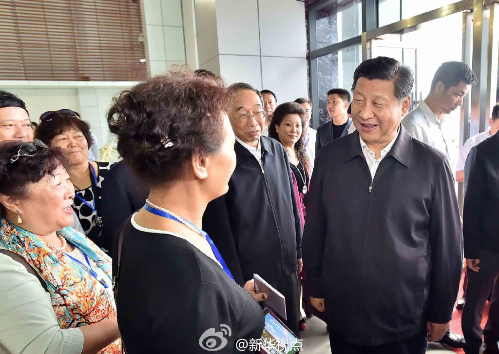 Chinese President Xi Jinping talks with tourists who are about to leave for southeast China's Taiwan at the Pingtan Strait Ferry Terminal in Pingtan, Fujian province, Nov. 1, 2014. (Photo source: Weibo account of Xinhua Shi Dian)