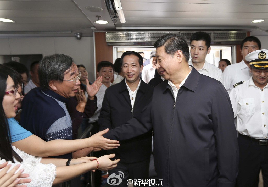 Chinese President Xi Jinping greets tourists after he boards a ferry that is about to leave for southeast China's Taiwan at the Pingtan Strait Ferry Terminal in Pingtan, Fujian province, Nov. 1, 2014. (Photo source: Weibo account of Xinhua Shi Dian)