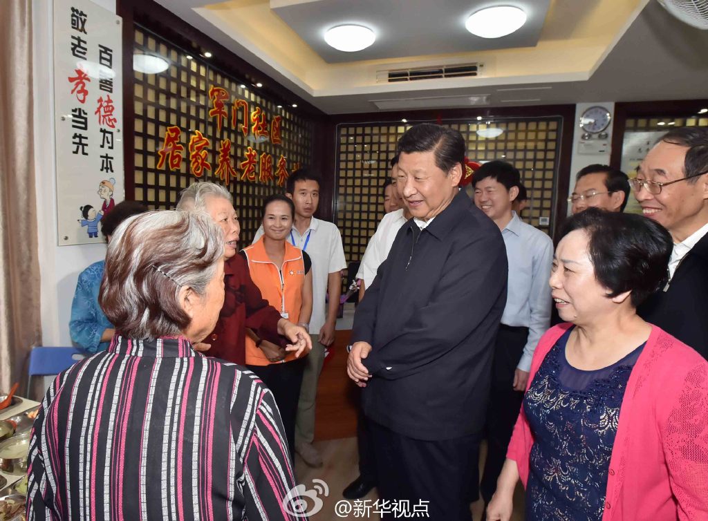Chinese President Xi Jinping talks with the elderly at a service station for the aged in the Junmen Community in Fuzhou, Fujian province, Nov. 1, 2014. (Photo source: Weibo account of Xinhua Shi Dian)