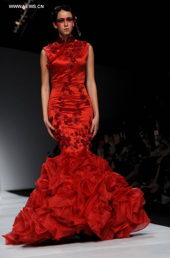 A model presents a creation by Indonesian designer Dominique Nadine during the Jakarta Fashion Week 2015 in Jakarta, Indonesia, Nov. 5, 2014. (Xinhua/Agung Kuncahya B.)